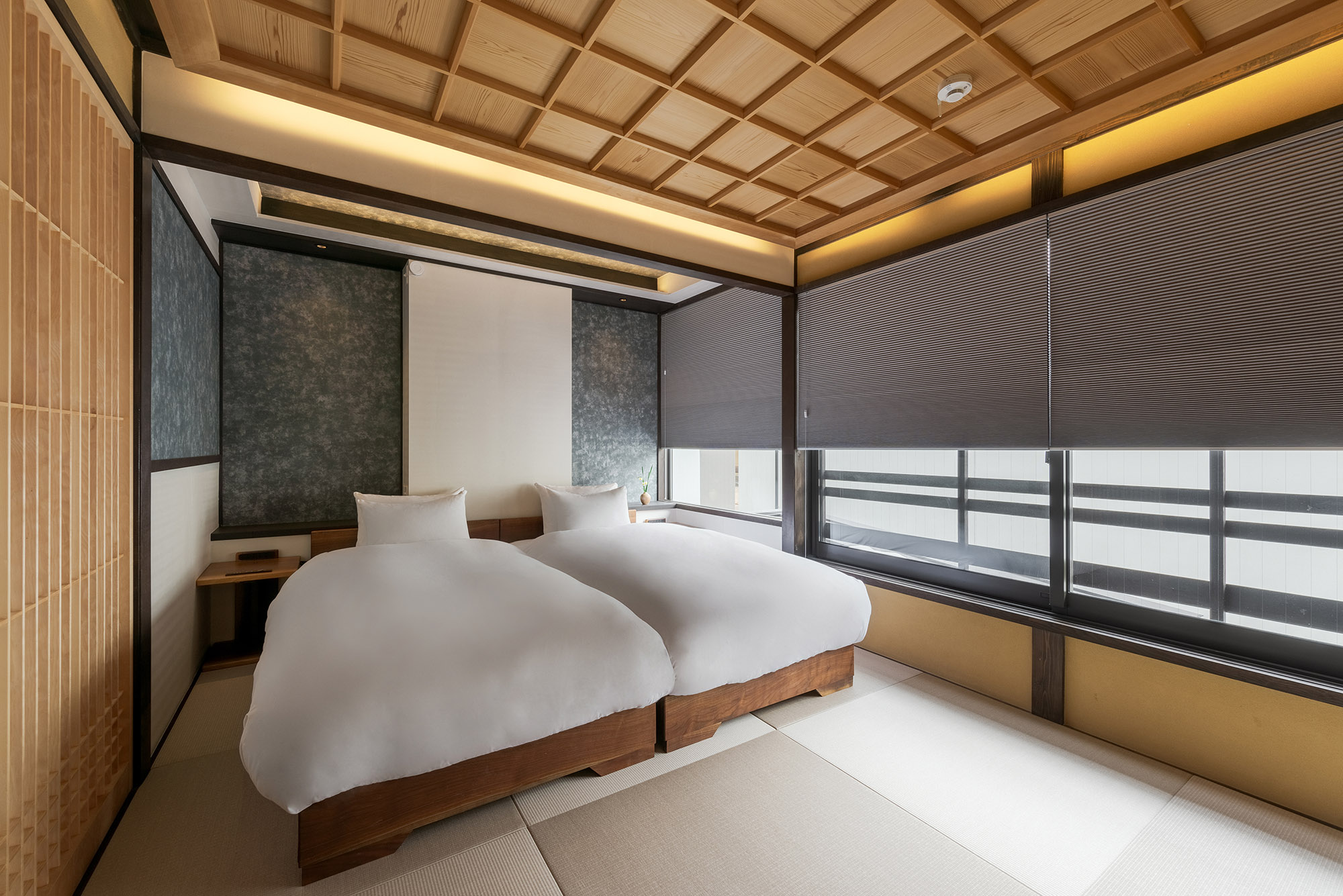 大きな窓から穏やかに陽が差し込む和寝室。天井には町家そのままの梁を残しました。畳ならではの心地よさに包まれながら、おくつろぎください。