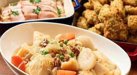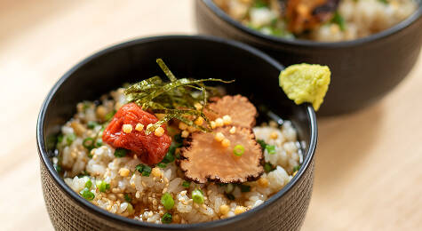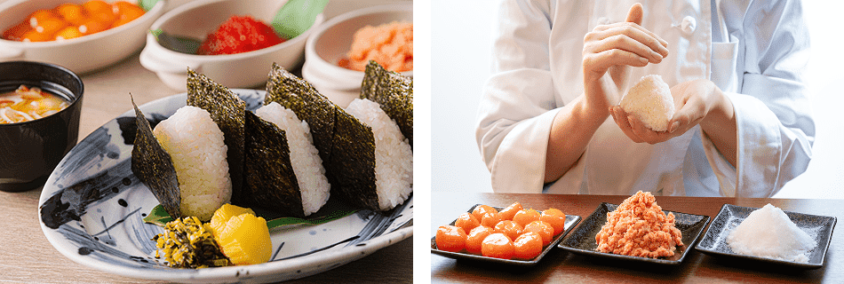 朝食会場にて、お客様のオーダーを受けてから心を込めて ”むすび” ます。具材やお米など素材にこだわっており、オススメの一品は「卵黄醤油漬け」です。仕込みに30時間をかけ、醤油ベースのオリジナルのたれに漬けこんでおりとろっとろの食感が魅力です。