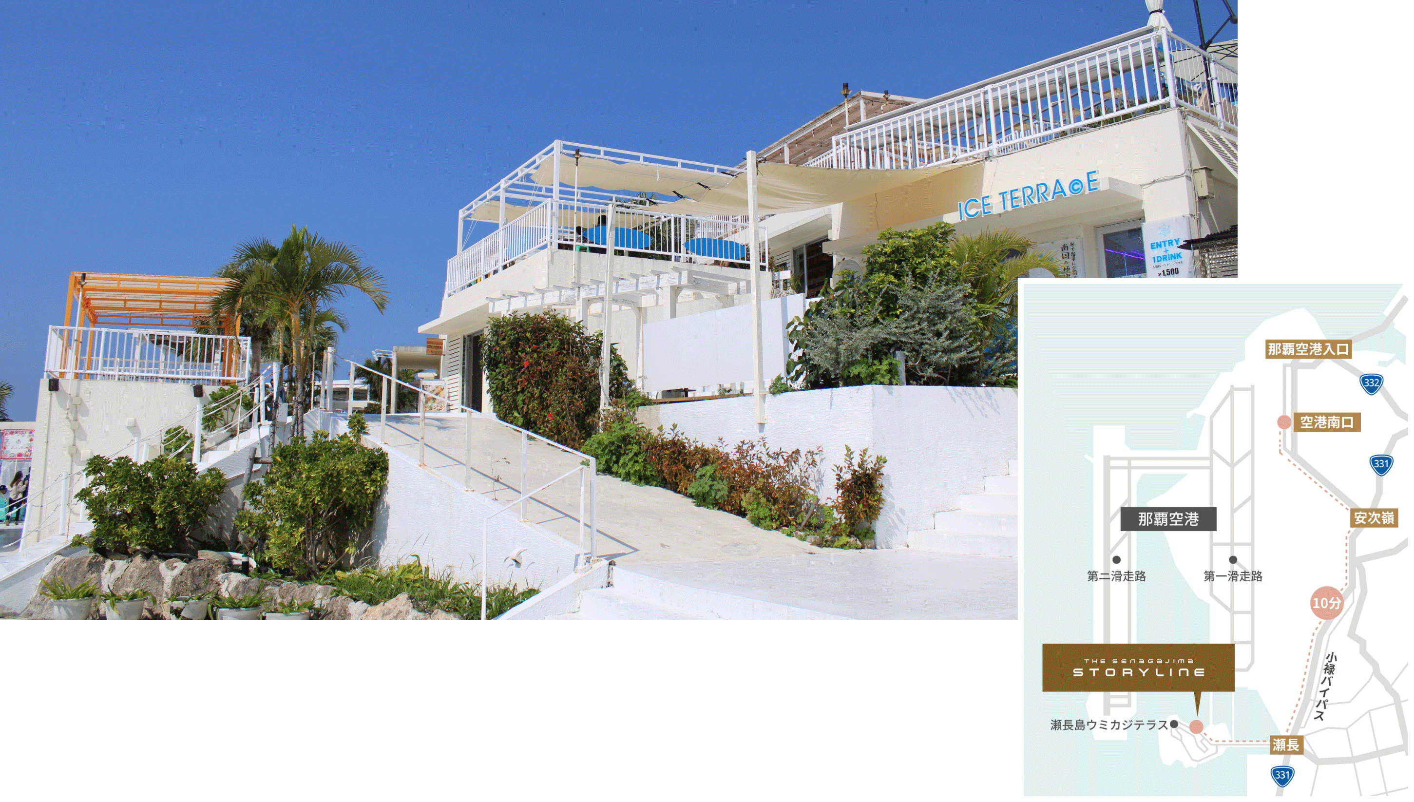タクシー 約10分(料金目安:約1,500円前後) 路線バス 那覇空港国内線旅客ターミナル / バス乗り場①番より東京バスTK02 「ウミカジライナー」“糸満市役所”“琉球ホテル&リゾート 名城ビーチ”方面行きに乗車、「瀬長島/ウミカジテラス」で下車後、徒歩約3分。