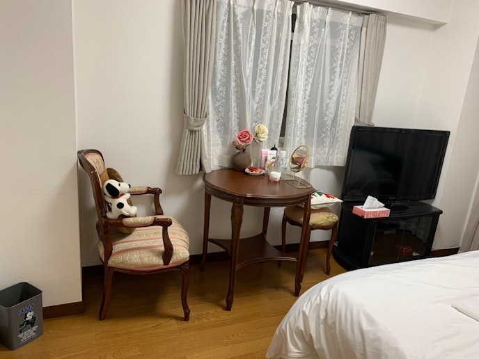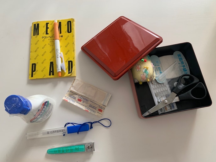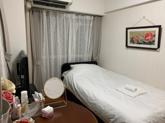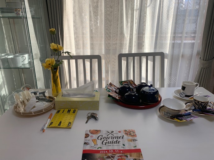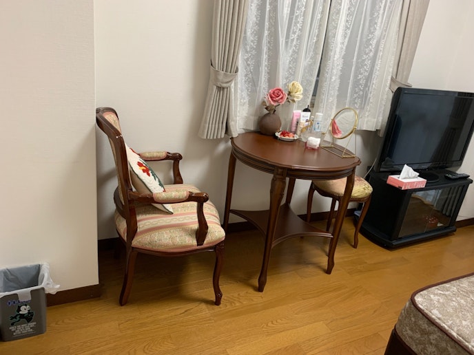 洋間のテーブルに化粧水、乳液、綿棒、コットン、拡大鏡などが置いています。
