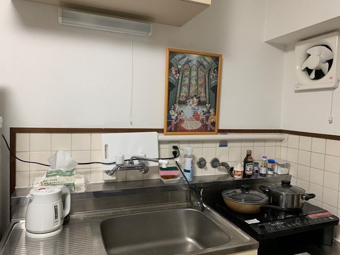 調味料、お鍋、お玉、料理する物はサランラップも一通り有ります。