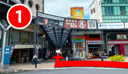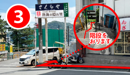 ③熱海プリン待合所の角を左に(海へと向かう方向に)曲がってください。右手に「熱海の隠れ里」の看板があるので、その下の階段を降りてください。