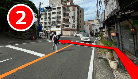 ④海側方面から来る場合や、スーツケースなどのお荷物があり、階段移動が難しい場合はピンクの「さくらや」の看板のところを左に鋭角に曲がります。