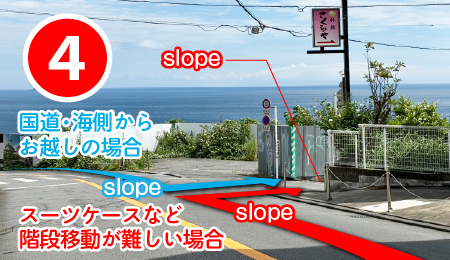 荷物が多い場合は❹を曲がり、坂道で下るルートが道幅が広く、安心してお越しいただけます。お車で国道方面(ビーチ方面)からお越しの場合もこちらのルートをお使いください。