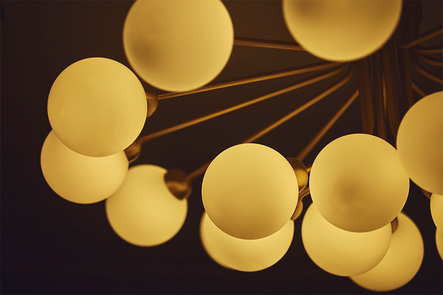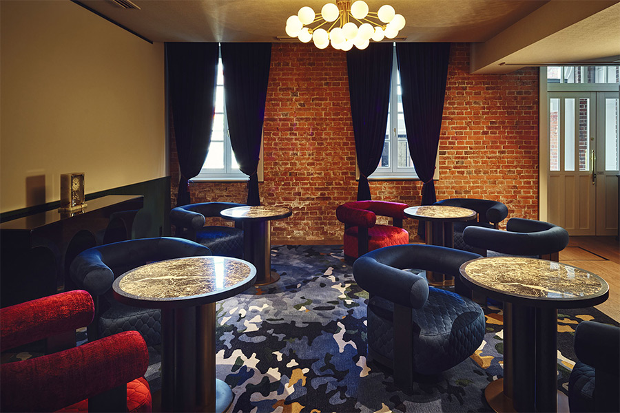 金管楽器をモチーフにしたライトが照らすラウンジは、