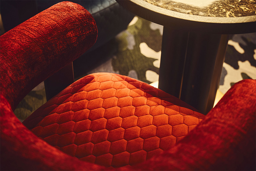 長崎浮世絵版画からインスピレーションを得た模様のラグに、居心地のいいチェアを配置。