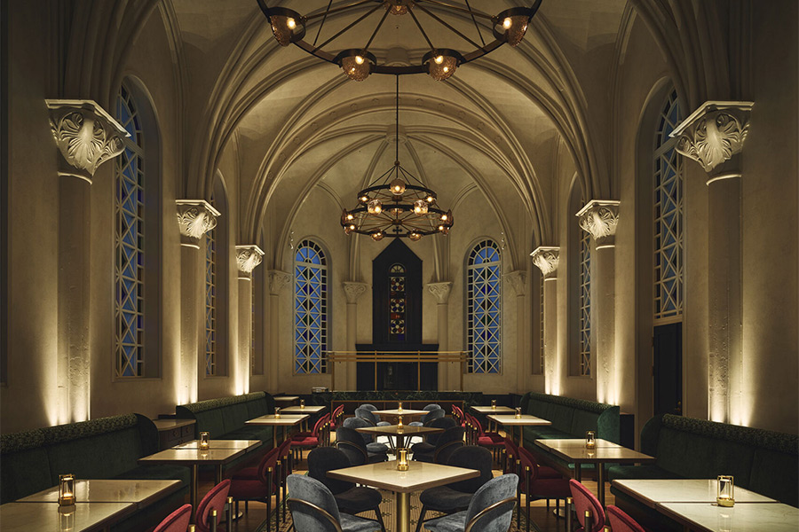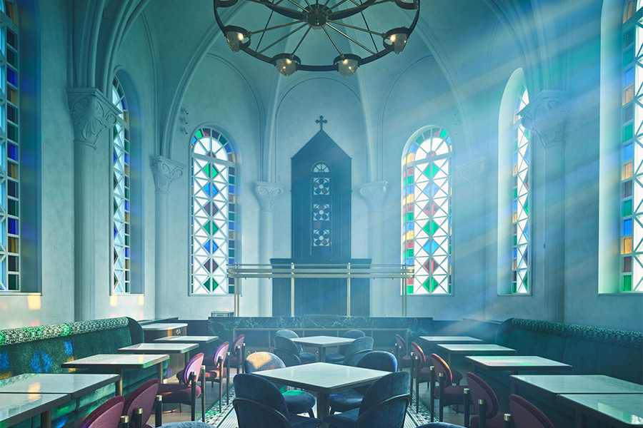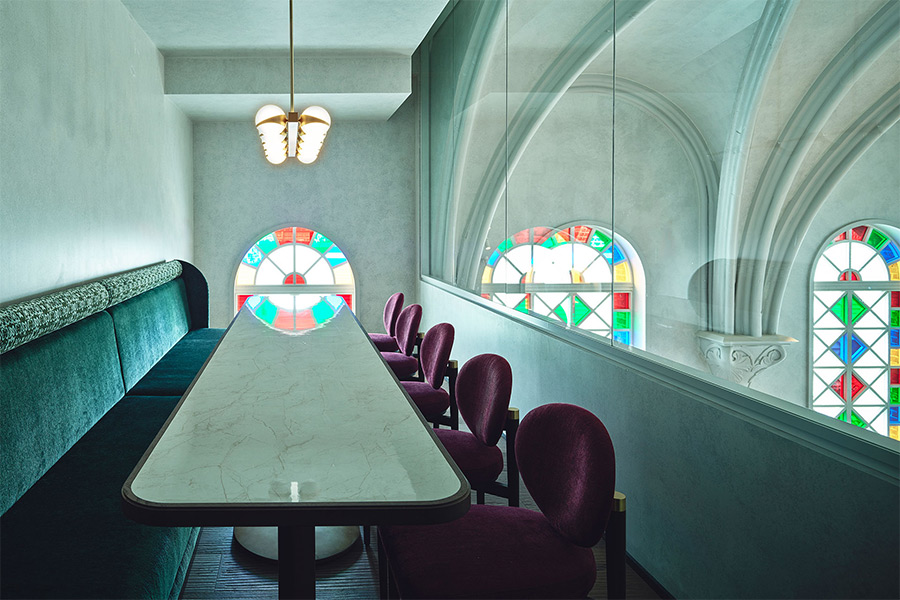 ステンドグラスの光が差し込み、聖堂のレストランを一望するプライベートな空間で、