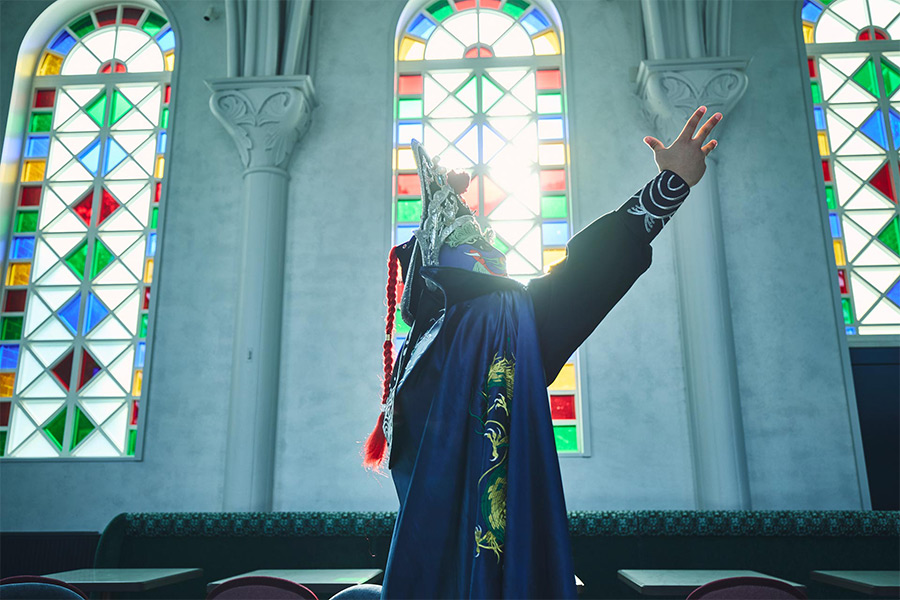 色とりどりに煌めくステンドグラスと約10mの天井高をもつ、かつて聖堂として使われていた空間。