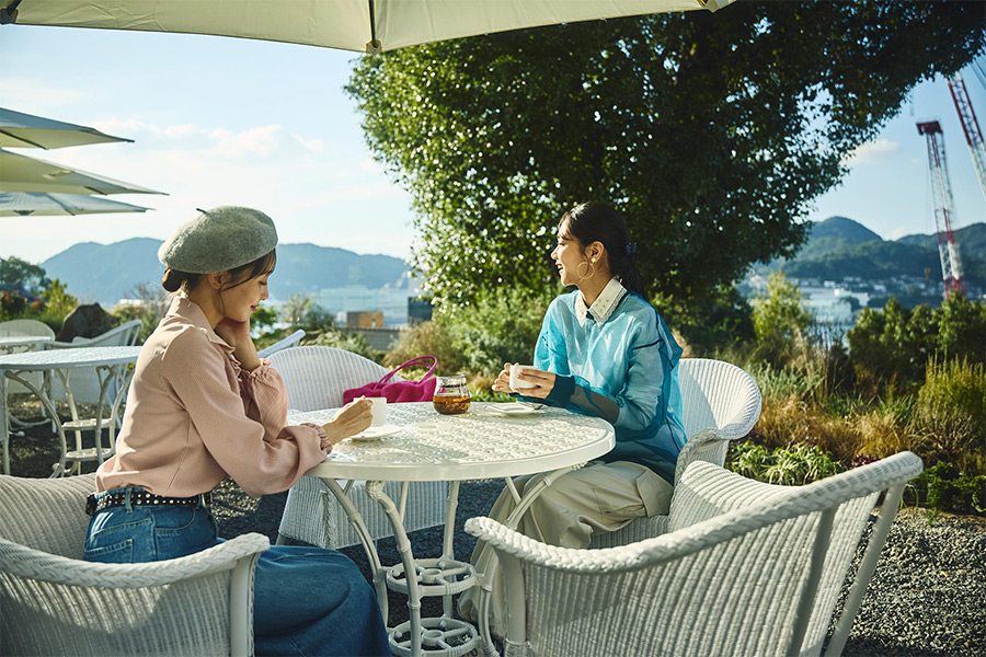 美しい山の稜線と船が行き交う長崎湾を望む、緑に囲われたガーデンテラス。