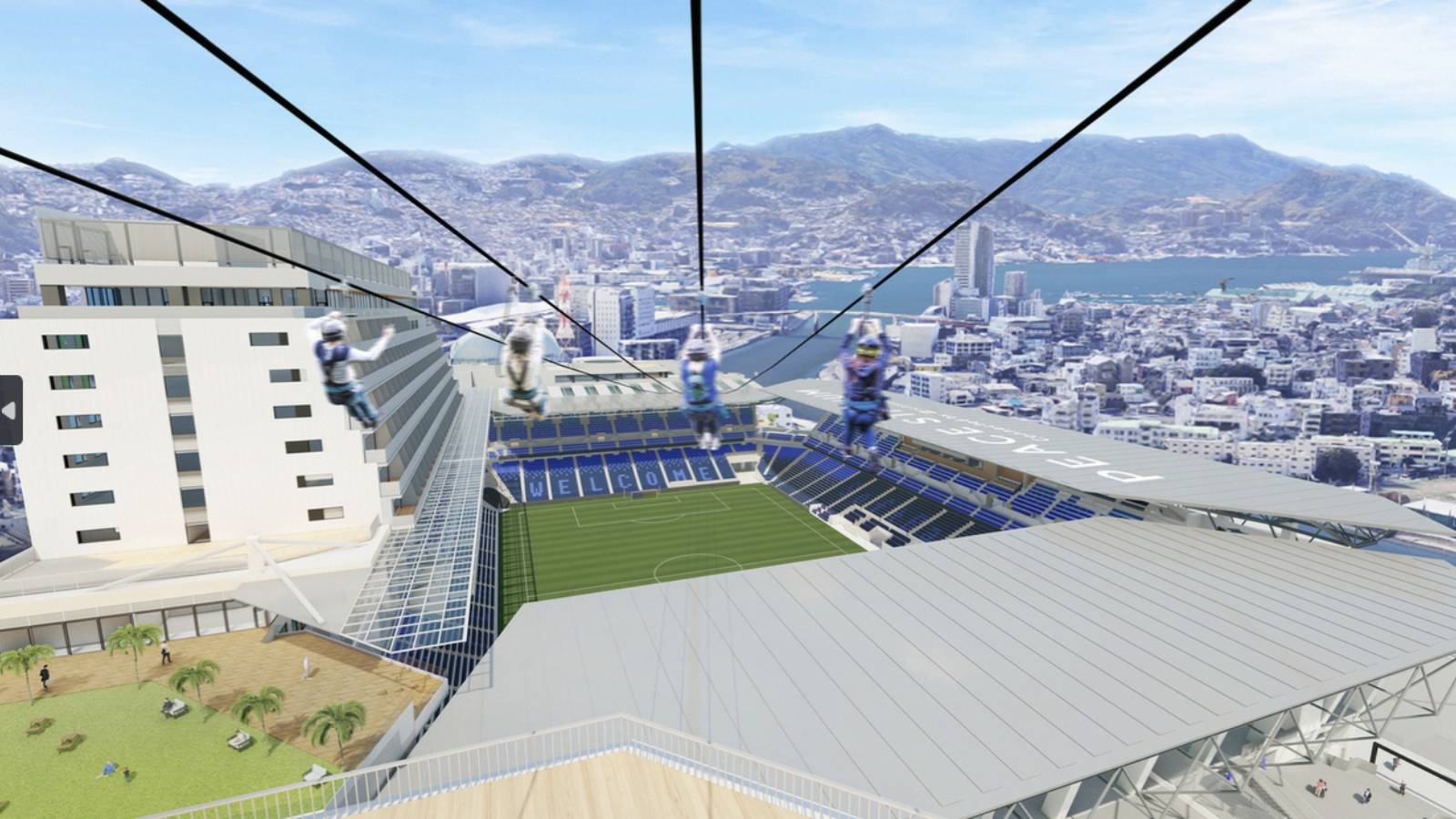 長崎スタジアムシティのオフィス棟「STADIUM CITY NORTH」屋上から商業棟「STADIUM CITY SOUTH」屋上を結ぶ、