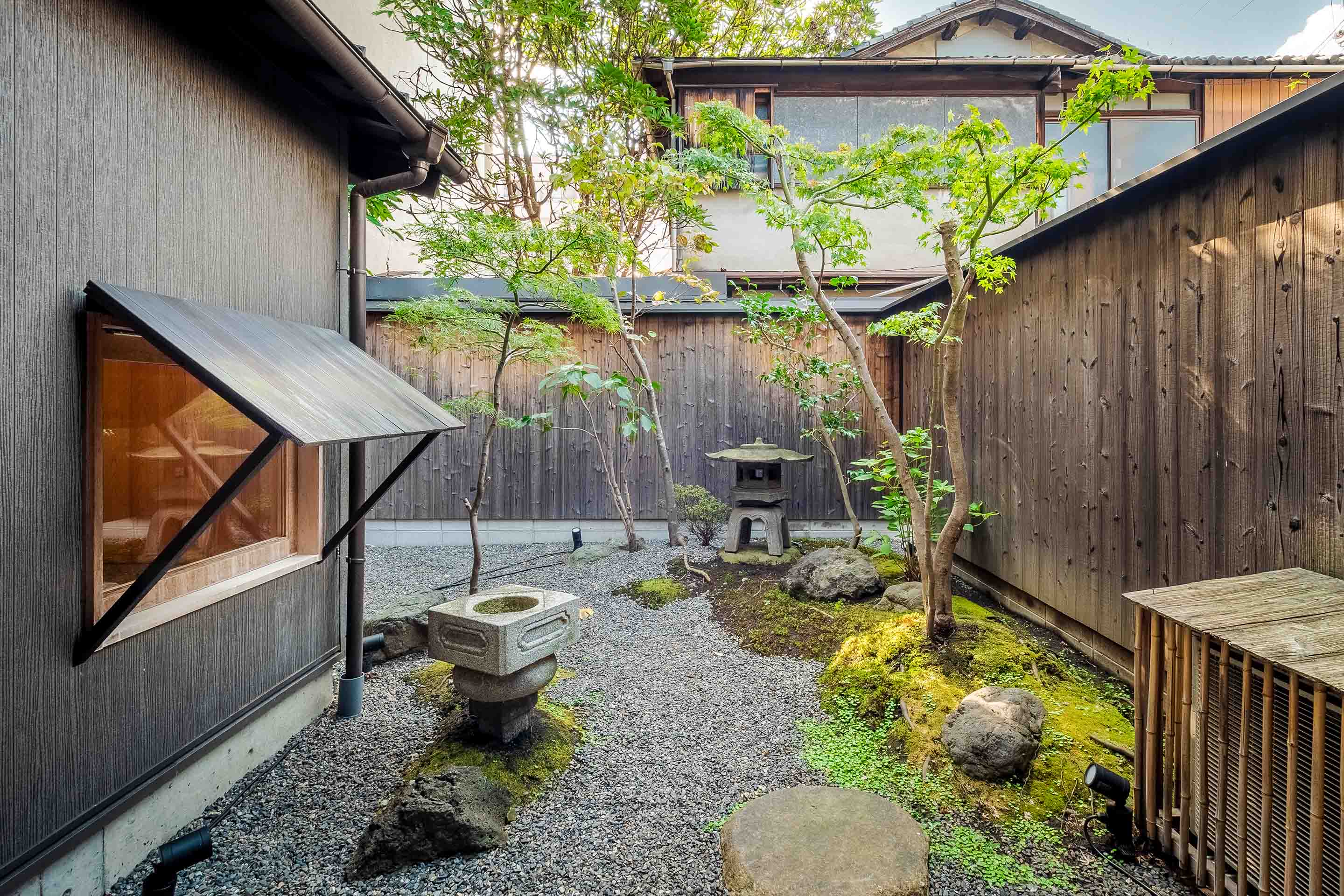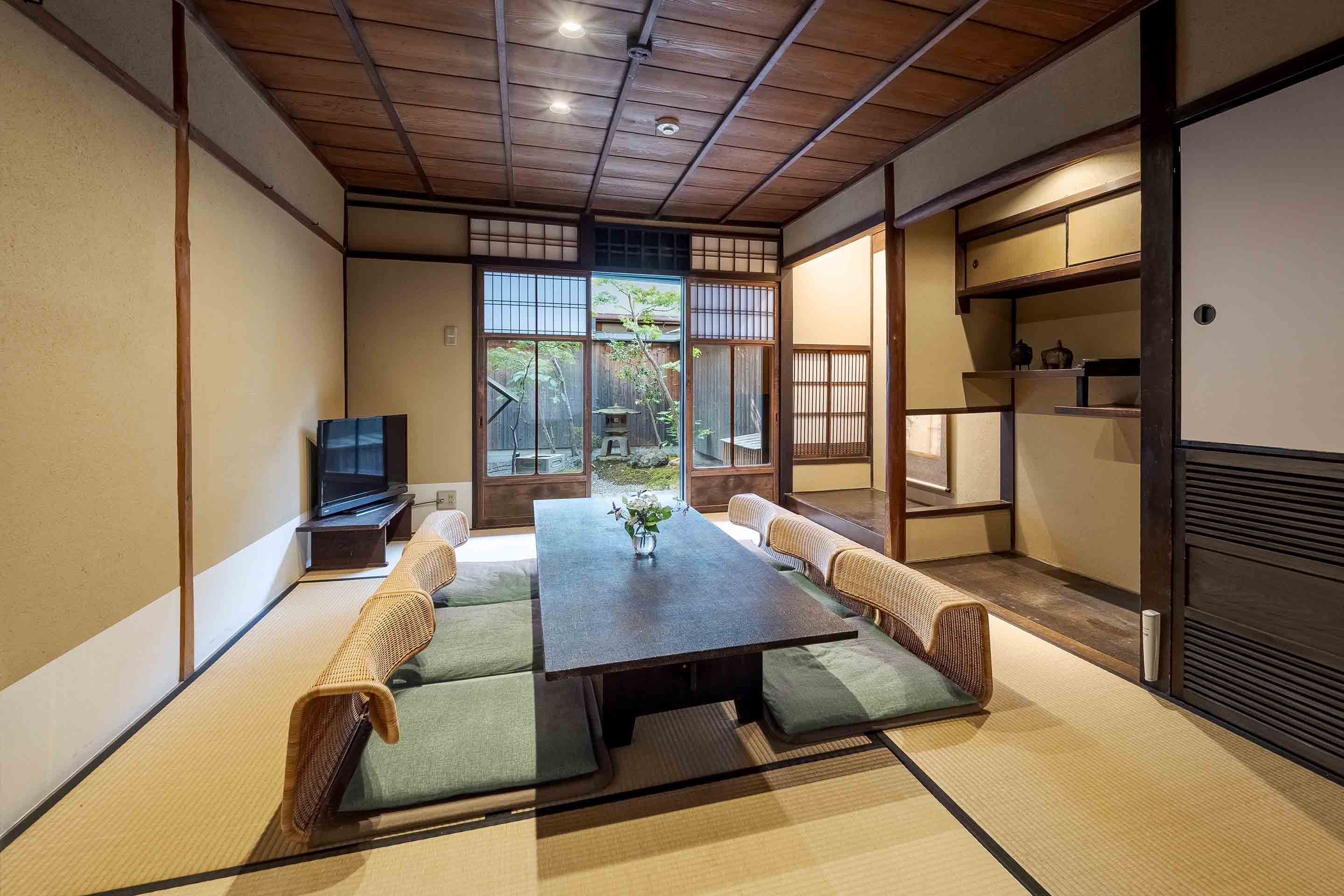 町家特有の吹き抜け「火袋」を残した土間空間、四季折々の坪庭を楽しめる居間など町家の伝統に満ちた