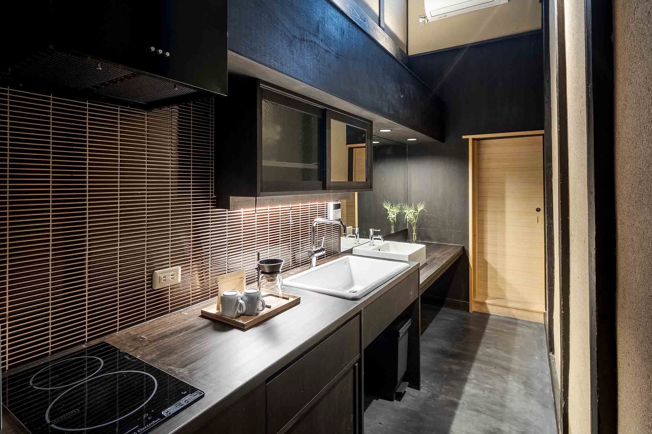 町家の奥に自然の光を届ける坪庭に面した居間、京町家(京町屋)特有の吹き抜け「火袋」が開放的な土間空間、自炊のできるキッチン、木目が明るい浴室のある1階。