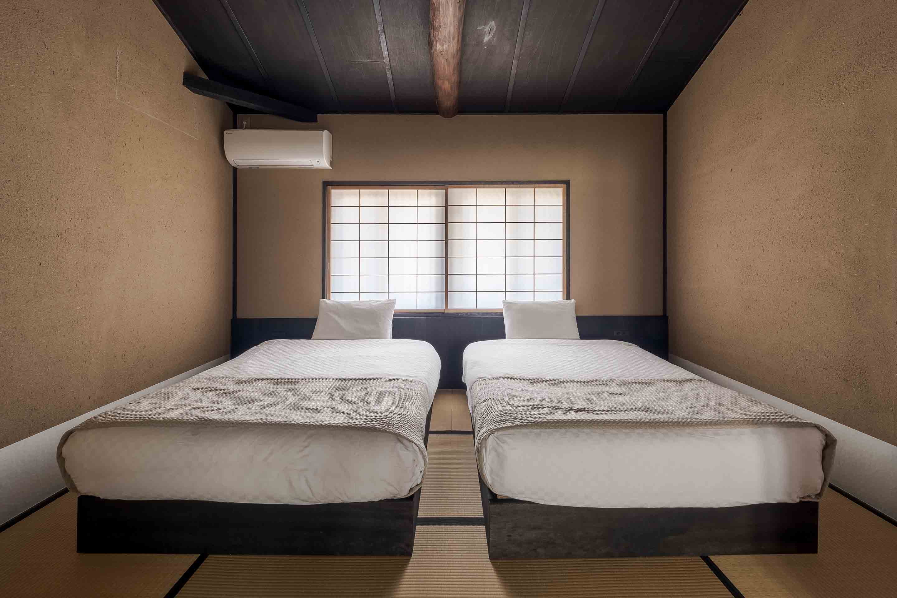2階にはゆったりとしたセミダブルベッド2台備えた洋寝室、天井を取り払い町家を支えてきた梁を剥き出しにした和室があり、最大7名様までご宿泊いただけます。