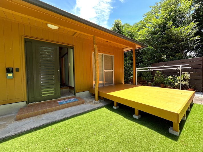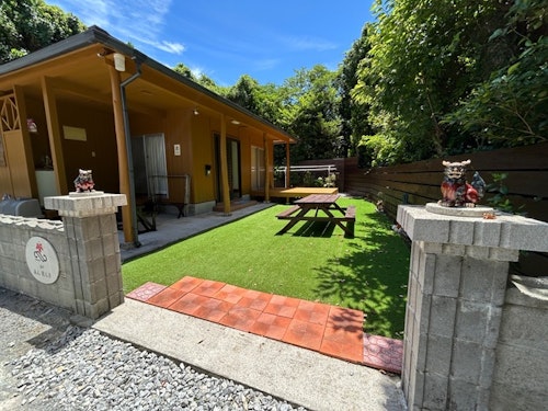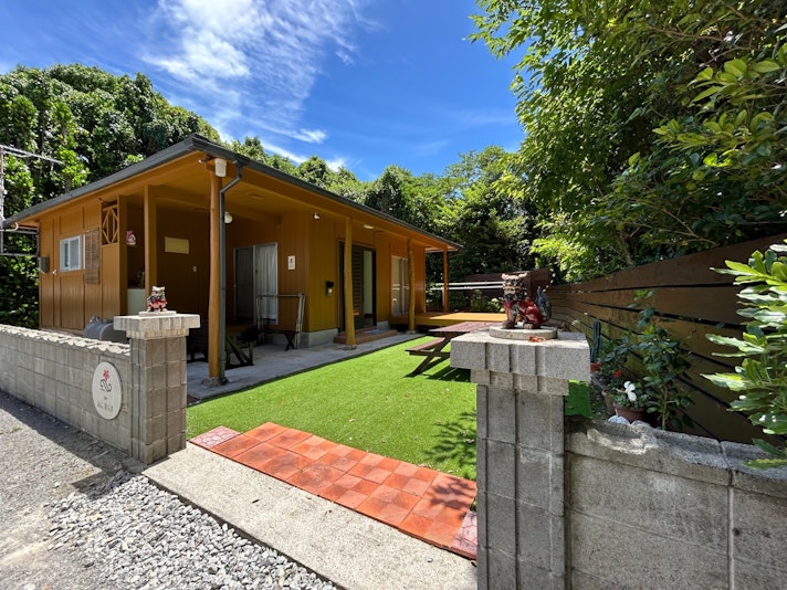 古民家風の平屋の一軒家。宿周辺はフクギの木で囲まれており、自然が多く残る場所です。