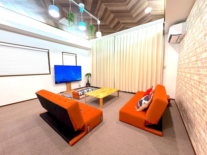 レンガ調の壁とウッド調の天井が印象的な共有ラウンジ。オレンジ系のソファと民族調のクッションがア...
