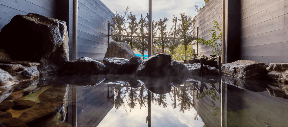 もちろん、源泉かけ流し天然温泉。大きな窓の向こうにしつらえた小さな日本庭園と空を眺め、南由布の時と自然の流れを独り占めするような贅沢なひとときを味わえます。