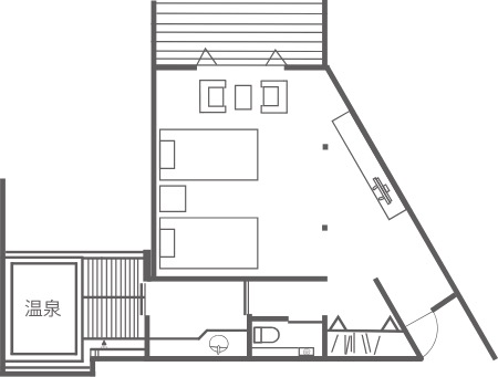 田園風景とローカル列車が見えるテラスと、源泉かけ流し天然温泉の内風呂、由布院のアートがさりげなく飾られたスタイリッシュな雰囲気に包まれた2名様用のお部屋です。