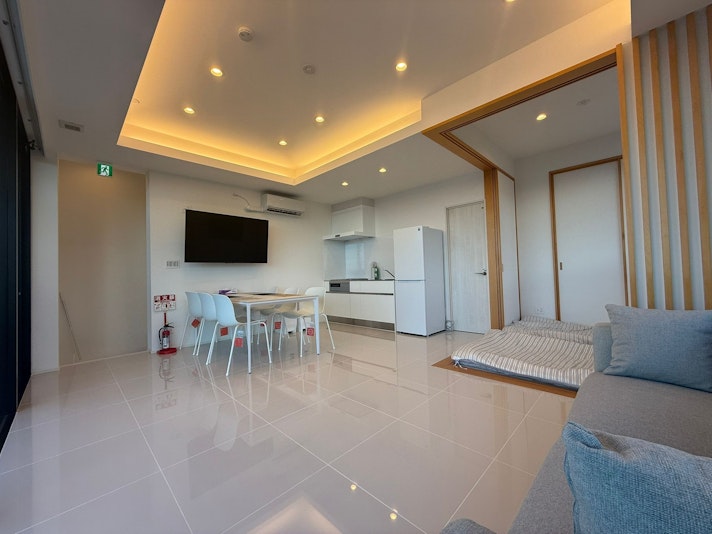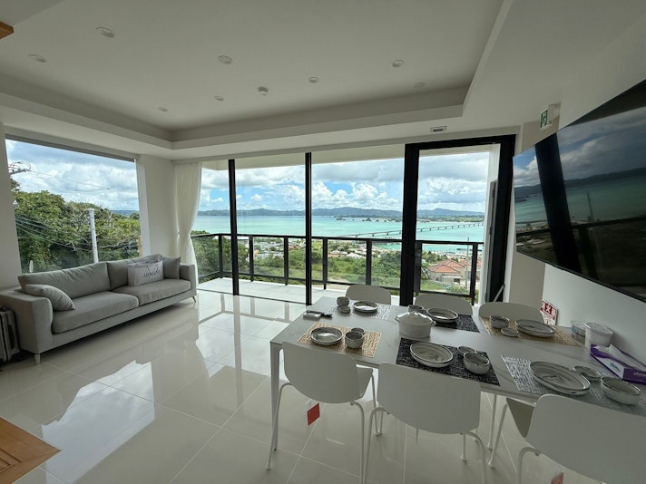 90平米3LDKの一戸建て。トイレ・バス各2つ、最大8名宿泊可能。ビーチやレストランへ車で3分以内。美しい景色を満喫。