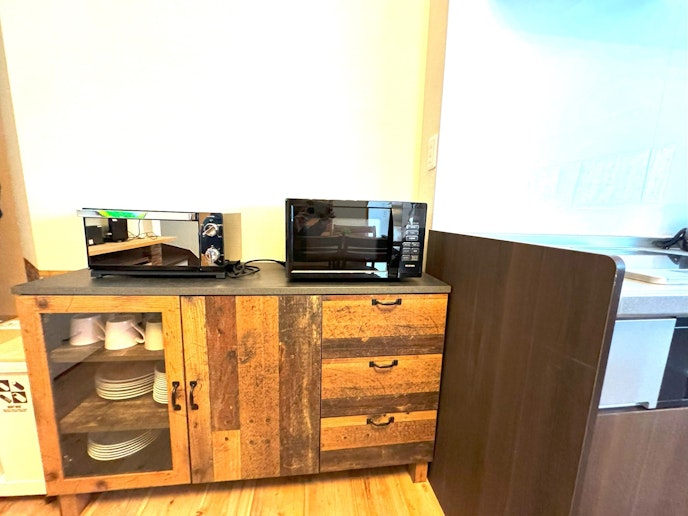 冷蔵庫・オーブントースター・電子レンジ・電子ケトル・炊飯器・深底ホットプレート完備