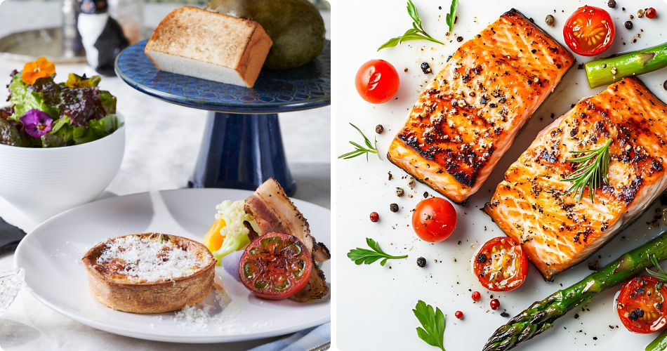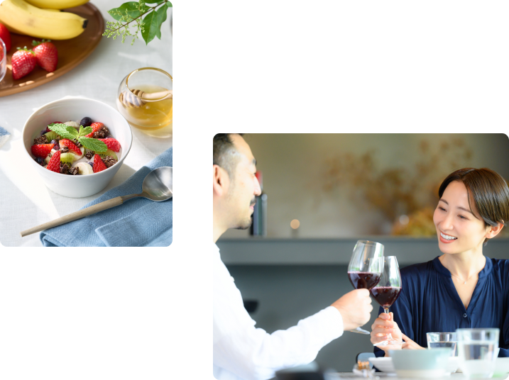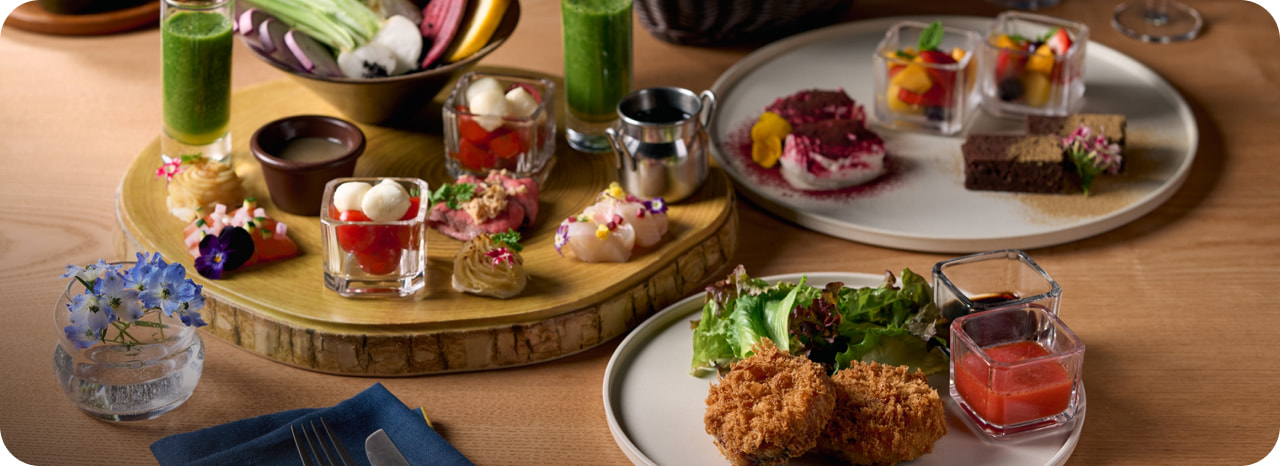 地元や旬の野菜を使った、からだにやさしい料理をご提供。夕食はシェアコースや和を取り入れたアラカルト、朝食はカフェスタイルで焼きたてパンと選べるメインをご用意。自然の恵みを囲む、心ほどける食のひとときを。
