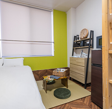コンパクトスペースに畳を敷いて、ダブルベッド1台とバンクベッド(2段ベッド)1台を備えたお部屋と人気の"Refa"製品をご用意♪