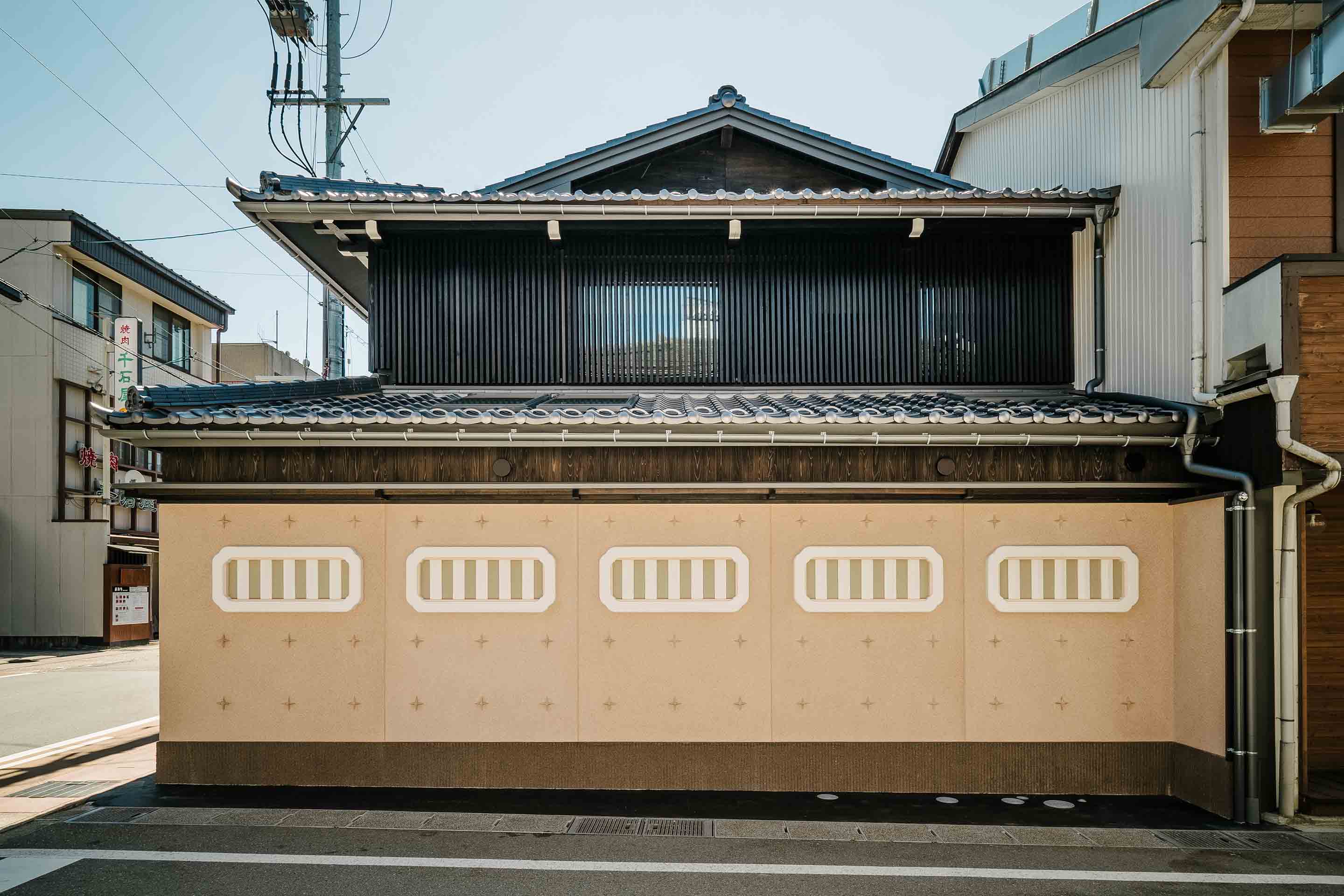 高山出身の左官職人 挾土秀平氏による左官アートで彩られた外壁。町家の2階に設けられる「虫小窓」を伝統要素として、あえて1階にリズミカルに配しました。