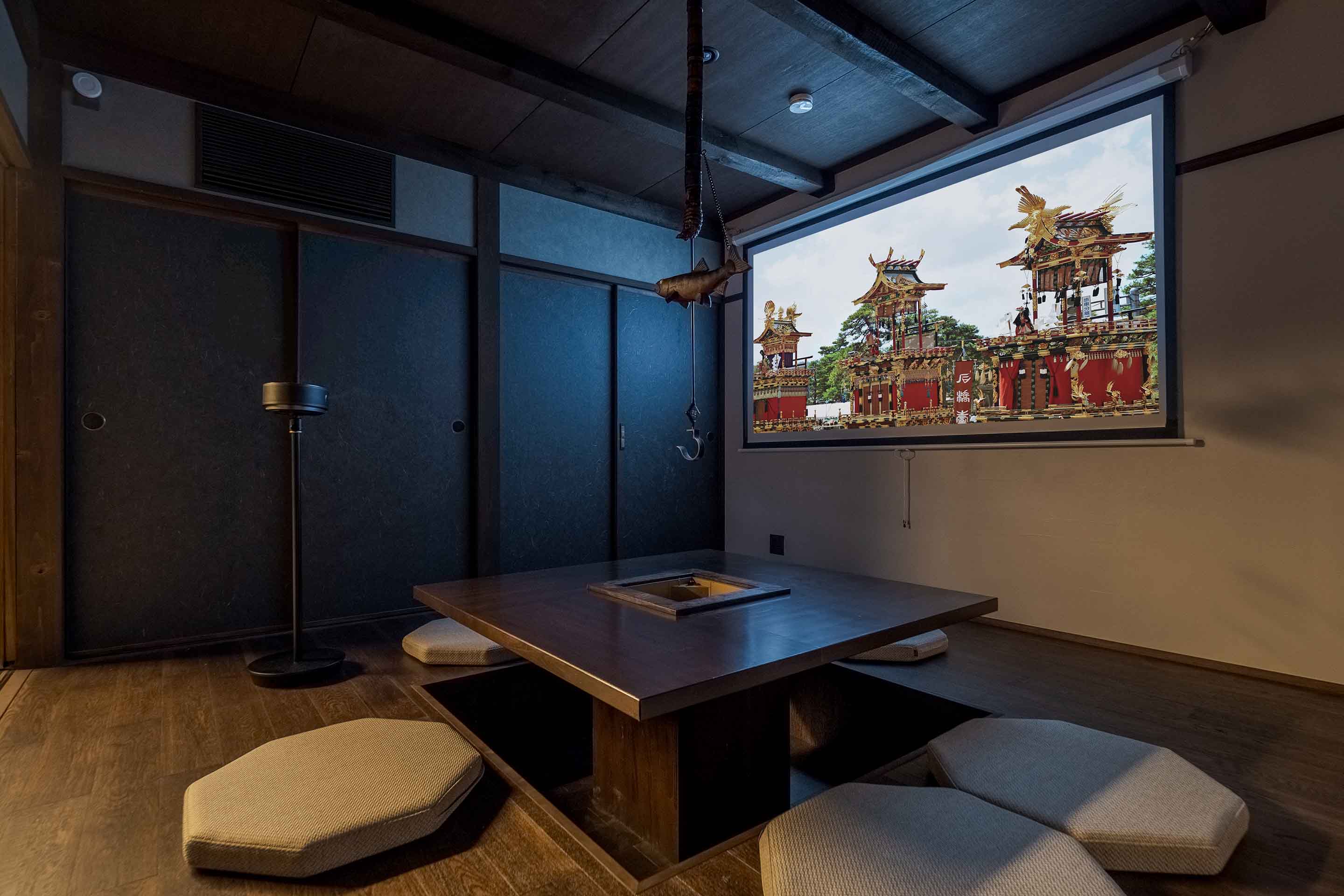 掘り炬燵風の囲炉裏テーブルが印象的なリビングダイニング。大迫力の映像を楽しめるプロジェクターも完備。