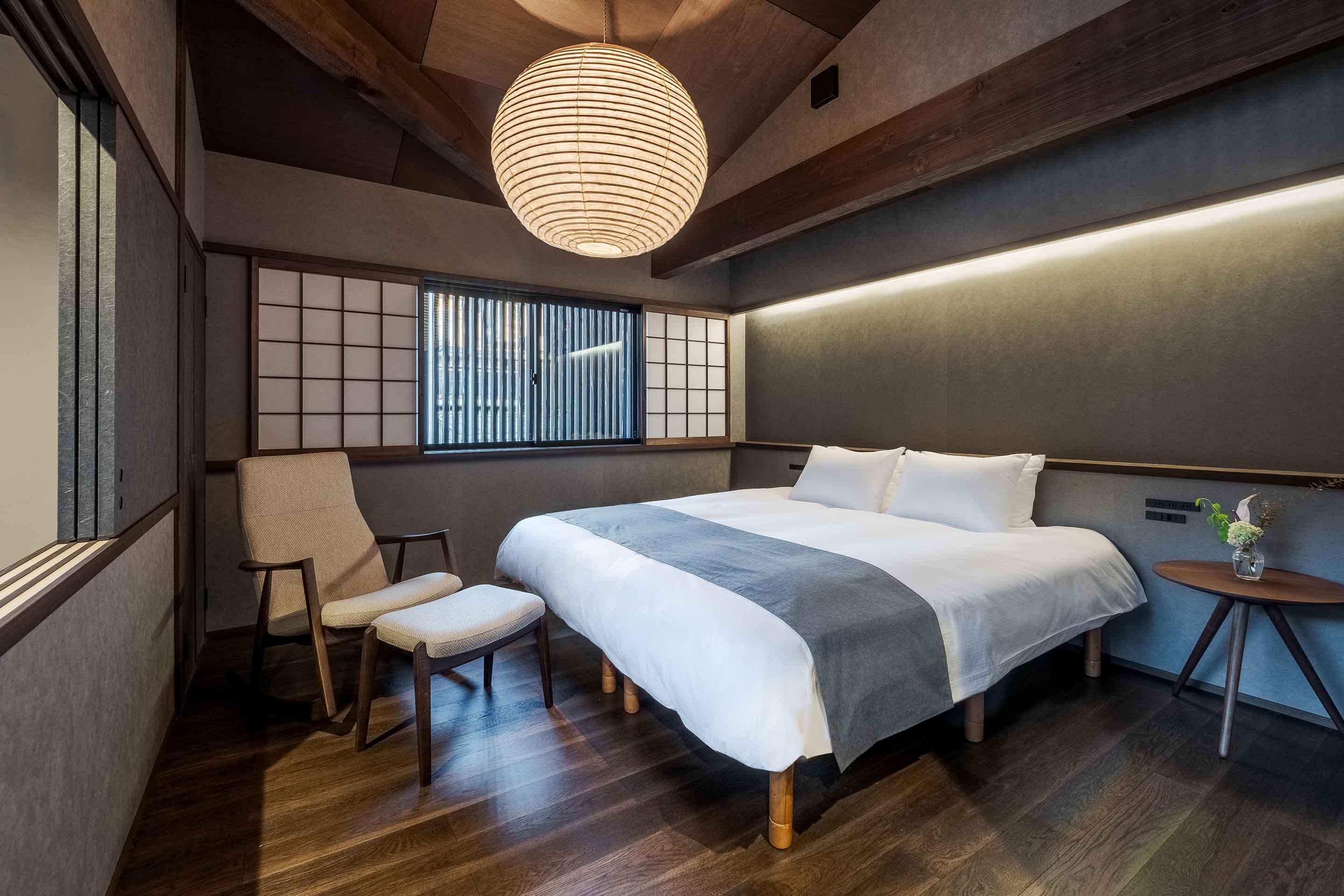 糸屋格子が見える窓からやわらかな日差しが届く寝室。揺れ心地の良いロッキングチェアに腰掛けて、読書や癒しの時間をお楽しみください。