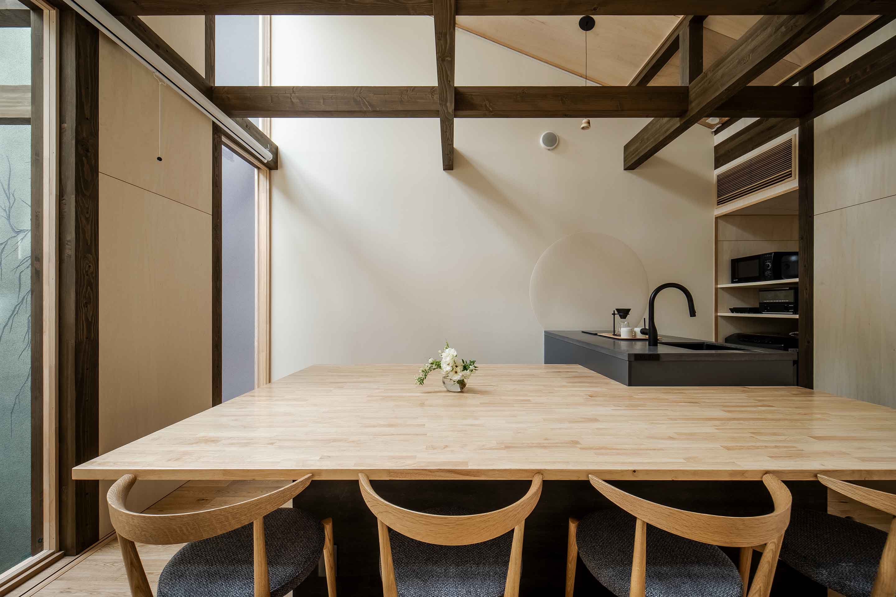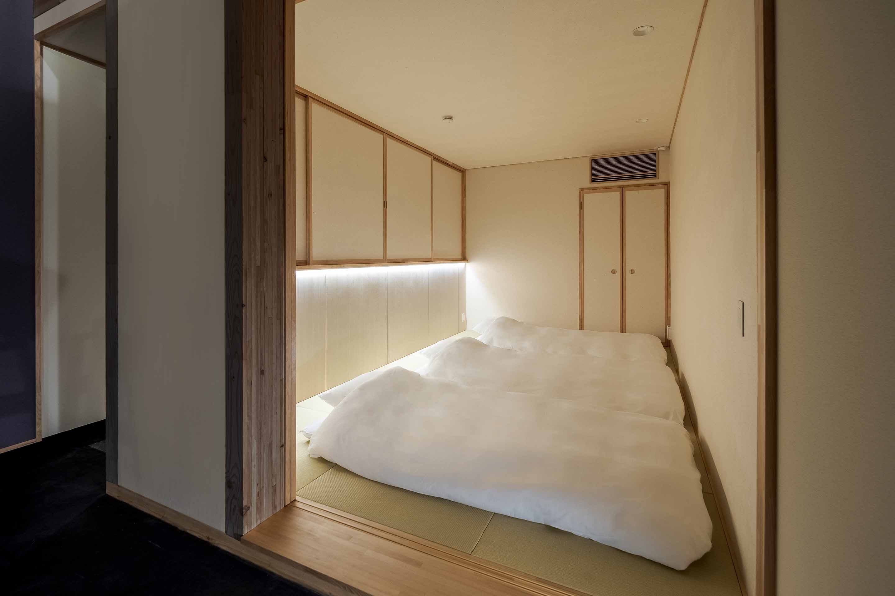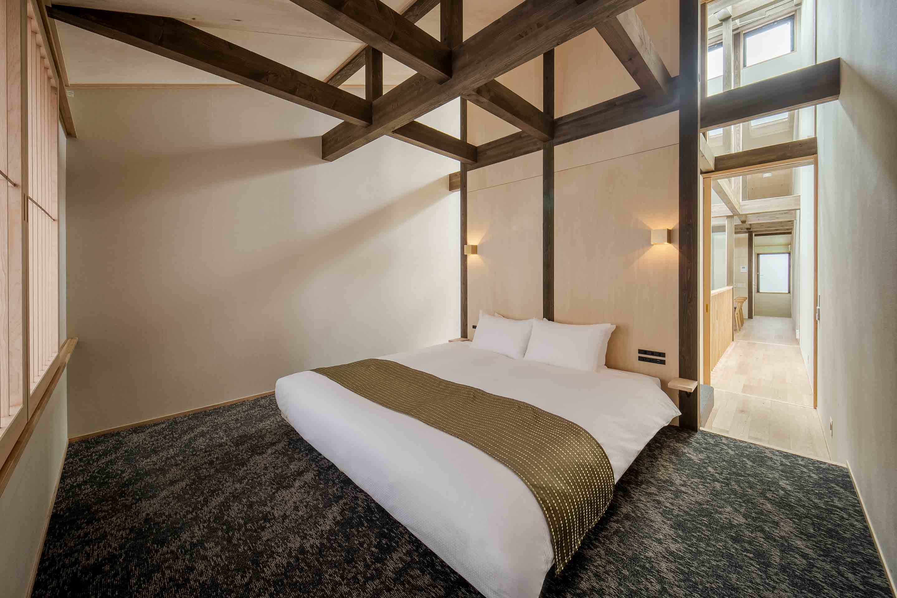 天窓から光の差し込む光庭には地元の職人による約9mの左官アートが彩り、オープンキッチン付きのリビングタイニング、和洋寝室を備え最大6名様までご宿泊いただけます。