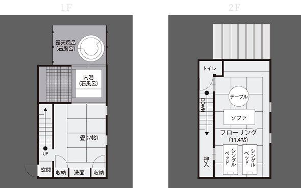和の寛ぎと、上質な眠りを叶える二層構造の客室。露天風呂と内風呂を備え、 湯と整いを心ゆくまでご堪能いただけます。
