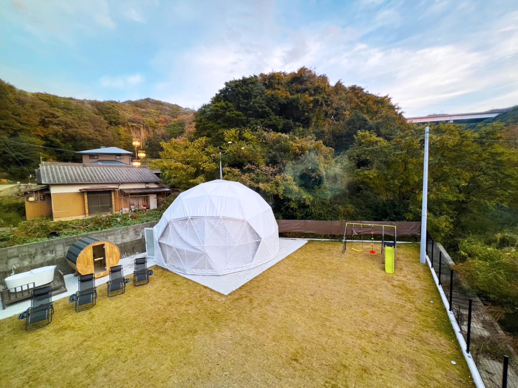 最大8名宿泊可|サウナ&水風呂|ペット・BBQ可|ドームテント内に遊び場あり