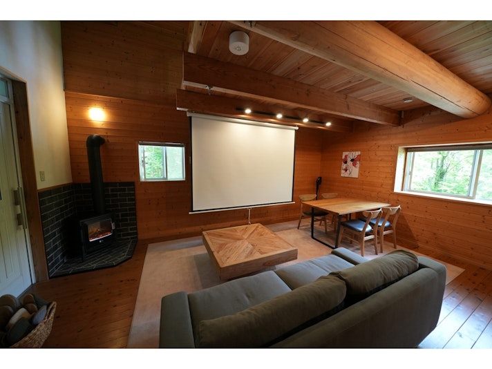 自然囲まれ、静かな環境で最大10名宿泊可能。暖炉と大型スクリーン完備の貸切ヴィラ。