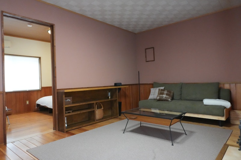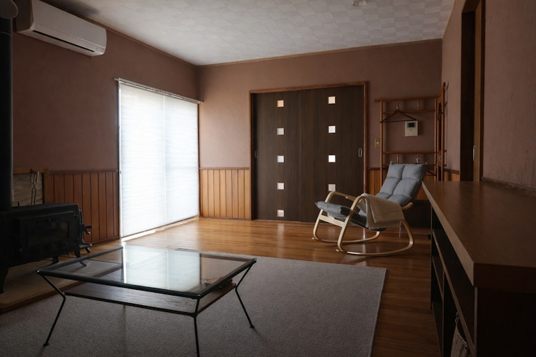 薪ストーブとソファベッドがあるリビング
