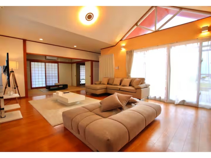 高天井リビングと広大な芝生で大人数もゆったり!BBQも楽しめる一棟貸し。