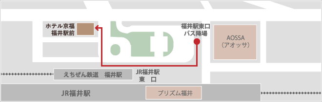 北陸自動車道福井ICより下車、国道158号線を福井市街地方面に約4kmお進みください。豊島交差点で右折し約500mほどで当ホテルに到着となります。福井駅東口ロータリー北側に面しています。