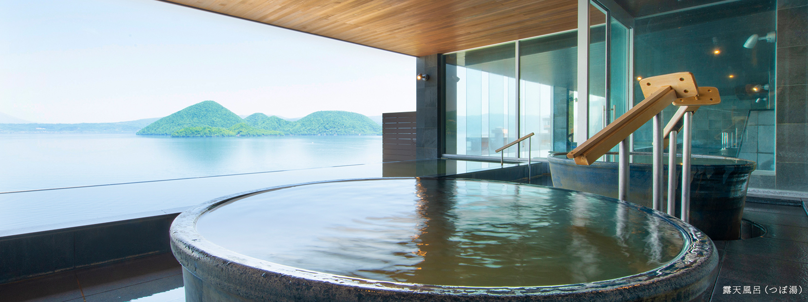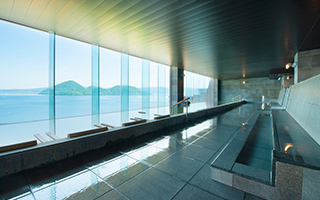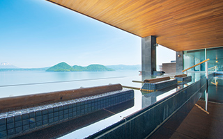 湯に身をゆだねると、洞爺湖が目線に広がるインフィニティ露天風呂。