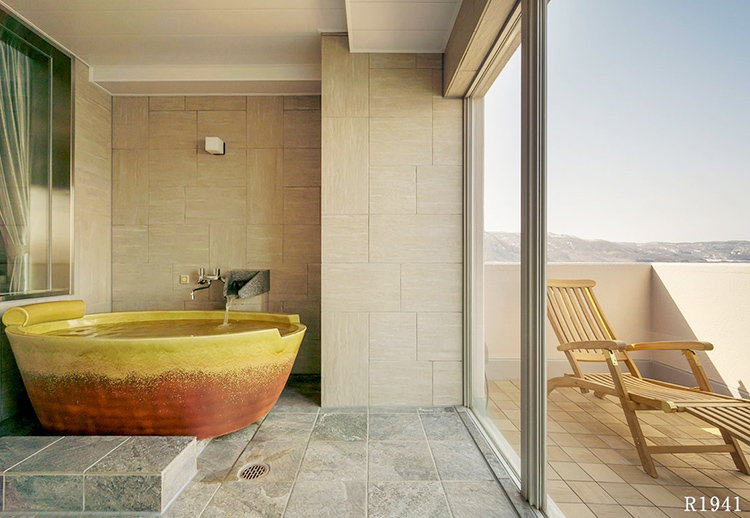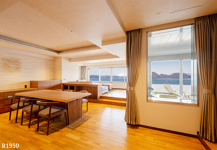 洞爺湖を一望する明るくスタイリッシュなリビング。快適なベッドと和の情緒が香る畳敷きの寝室。機能性とやすらぎが調和する心落ち着く空間。陶器の湯舟と、木のぬくもり溢れる和洋室でゆったりとお寛ぎください。