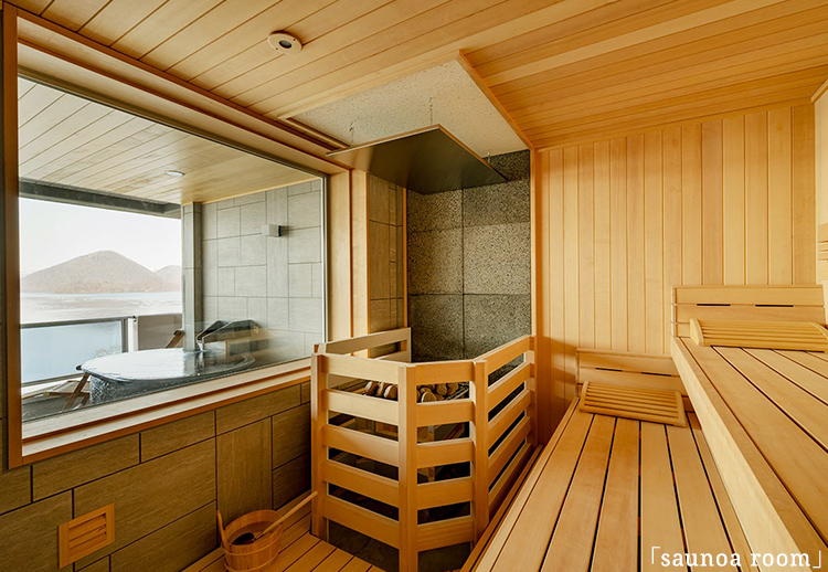 大きな窓から洞爺湖と羊蹄山を望むプライベートサウナ。 テラスには水風呂とリクライニングチェアを配した外気浴スペース。湖とともにサウナと温泉を満喫する、究極の“ととのい体験”をお愉しみください。