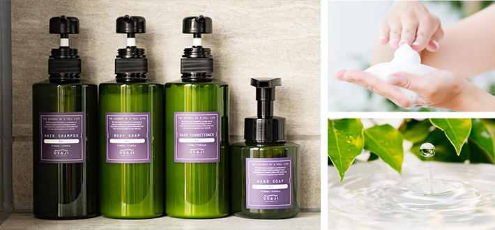 シャンプー、コンディショナー、ボディソープ、ハンドソープは「OSAJI」の「IKOI」。 特別なリラックスタイムにぴったりの、花束に顔を近づけたような香りに満たされます。 アミノ酸由来の柔らかな洗浄力でお肌や髪・頭皮を優しく洗い流してくれ、保湿成分もたっぷり配合されているのでしっとりとしたマイルドな使い心地をお楽しみいただけます。 香りに癒されながらごゆっくりとバスタイムをお過ごしください。