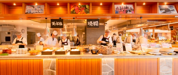 19種類から具材を選んで作る海鮮丼コーナー、鉄板に沸き立つ香り、炎に舞う中華鍋、活気に満ちたライブキッチンで作られる料理は和食・洋食・中華約90品。