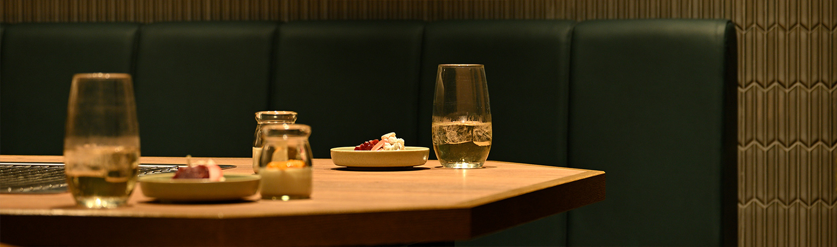 穏やかな灯りと木材を基調とした空間にある掘り炬燵、隣席と仕切りがある半個室で味わうのは和食会席膳。