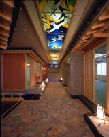 | 広々とした宴会場。和とモダンを絶妙に組みいれた素敵なエントランスは、宴に華をそえます。天井にはステンドグラスがはめ込まれ、ちょっと不思議な空間です。 |