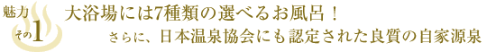 細かな気泡で全身を包み込んで癒してくれる泡風呂(バイブラバス)や、寝ながら入れる寝風呂など、七種類それぞれの特徴があり、また湯温も異なりますので、たっぷりのんびりとお好みで温泉三昧をお楽しみいただけます。