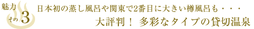 さらに、水入らずでお楽しみいただける貸切風呂は4種類もあり、絶景を独占できる展望風呂や、関東でも2番目に大きい樽風呂などお好みでお選びいただけます。