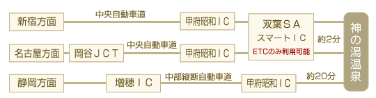 ECTを搭載しているお客様は、双葉サービスエリアスマートICをご利用ください。 約2〜3分ほどで、当館に到着いたします。 ※東京方面、長野方面の両方面(上下線)ともご利用いただけます。
