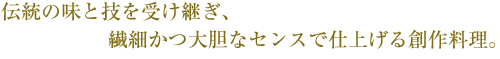 基本を忠実に守り継いできた技と味を大切にしながらも、磨きあげてきた繊細なセンスと大胆な発想と情熱をお料理に注ぎ込み、一皿々手作りの味で丹精込めて仕上げております。