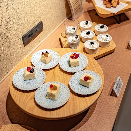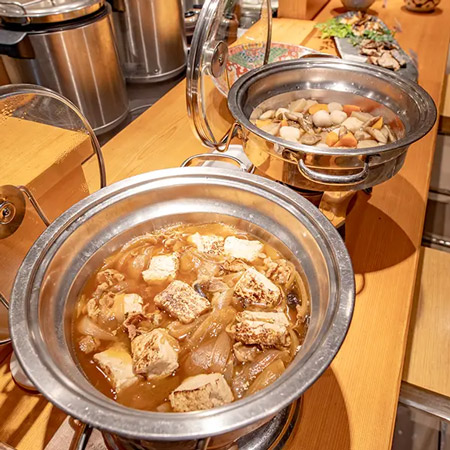 ご朝食はKISSUIEN1階のレストラン アウンにて、ビュッフェ形式でお届けしています。ビュッフェでも、できたてのような美味しさをお届けしたい。KISSUIENの朝食には、会席や居酒屋メニューで培ってきた多様な料理法が見え隠れしています。