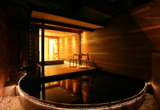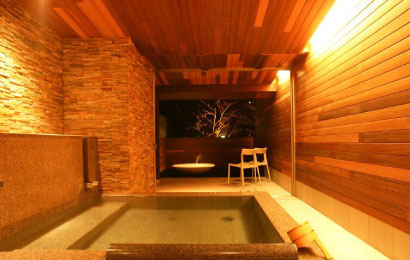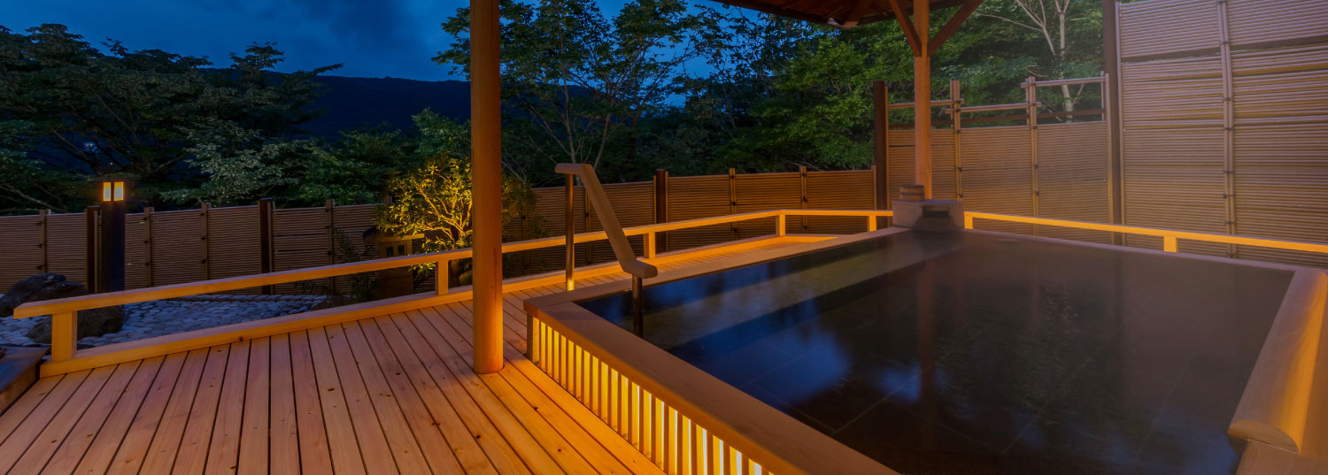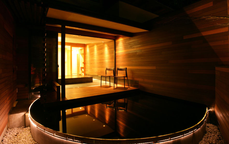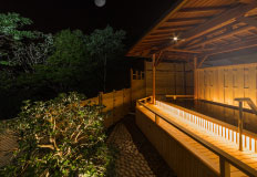 あえて温泉を使用しない天然水貸切風呂は「月」と「星」の二つ。お一人でのご利用から、複数人でのご利用まで、ごゆっくりとプライベートな湯浴みをお愉しみいただけます。傍らにはチェアーと円弧状の池が併設されており、さわやかな空気を感じながら夜空を見上げ、時の経つのを感じながら満天の星と美しい月をご堪能いただけます。