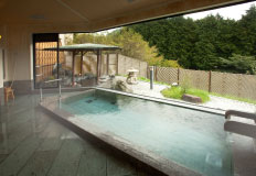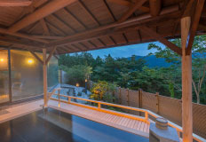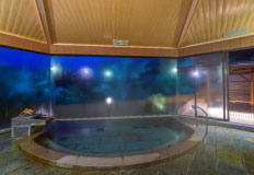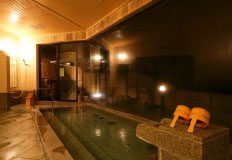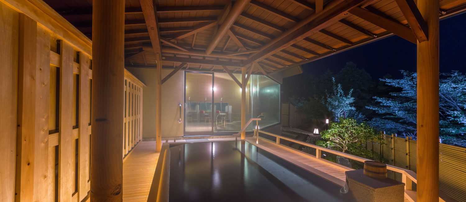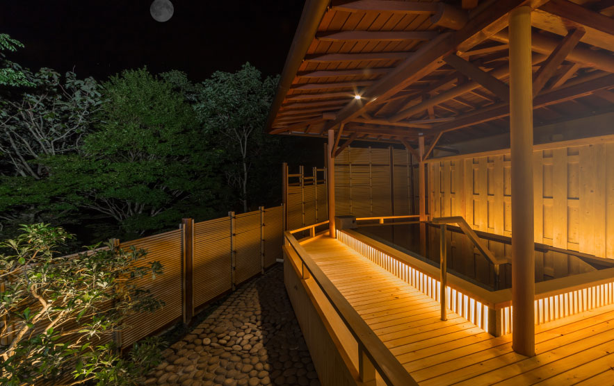 豊月ではこの温泉を一晩中、大浴場で愉しめることが自慢のひとつ。月が優しく語りかけてくれる静かな夜の湯浴みもまた酔狂。