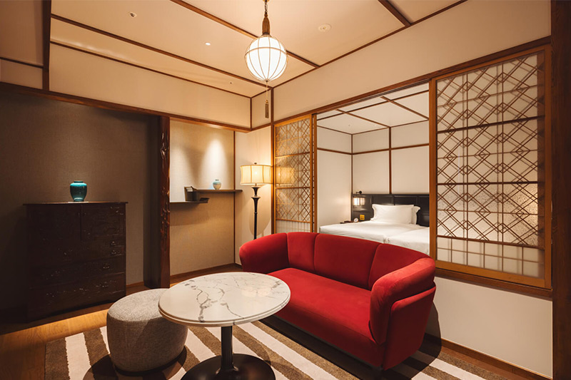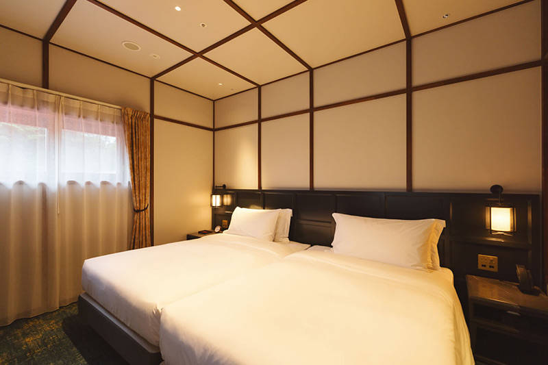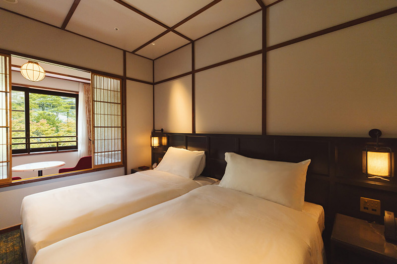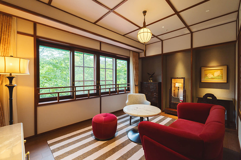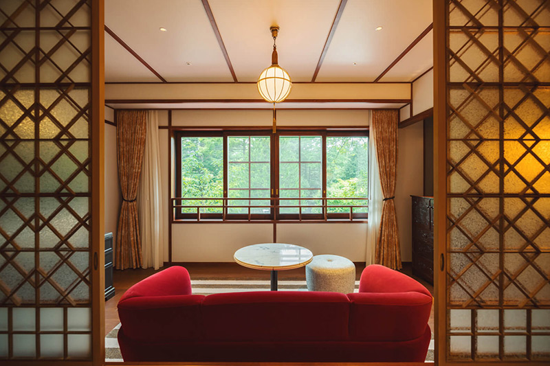この地を代表する伝統工芸品の軽井沢彫りのディティールや、久米権九郎による和洋折衷の建築デザインなど、万平ホテルらしい伝統的な設えを継承した客室。中庭の美しい四季折々の景色をお楽しみいただけます。